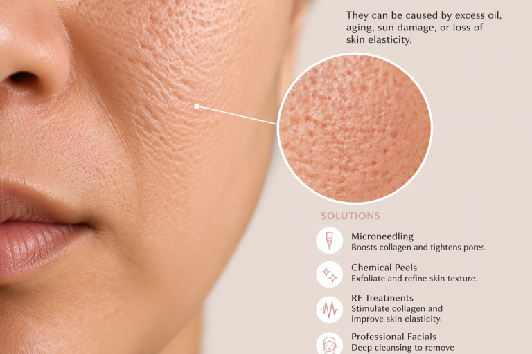 Often caused by excess oil, loss of collagen, or congestion, enlarged pores can make the skin look uneven.